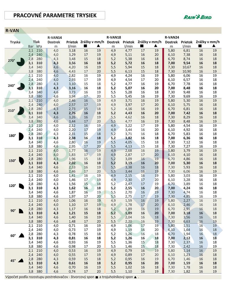 pracovné parametre trysiek rainbird r-van