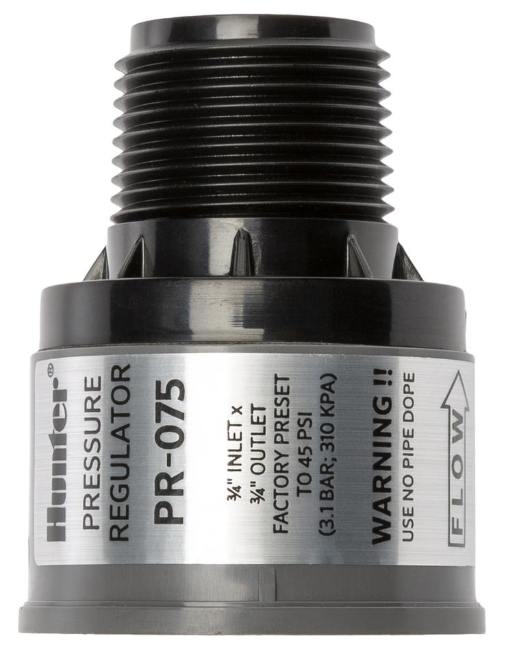 Regulátor tlaku Hunter PR-075 je kompaktné zariadenie určené na inštaláciu priamo pod rotačné postrekovače so vstupným závitom 3/4". Redukuje nadmerný vstupný tlak na optimálnu prevádzkovú hodnotu 3,1 bar, čím stabilizuje výkon trysiek a dokáže znížiť spotrebu vody až o 25 %.