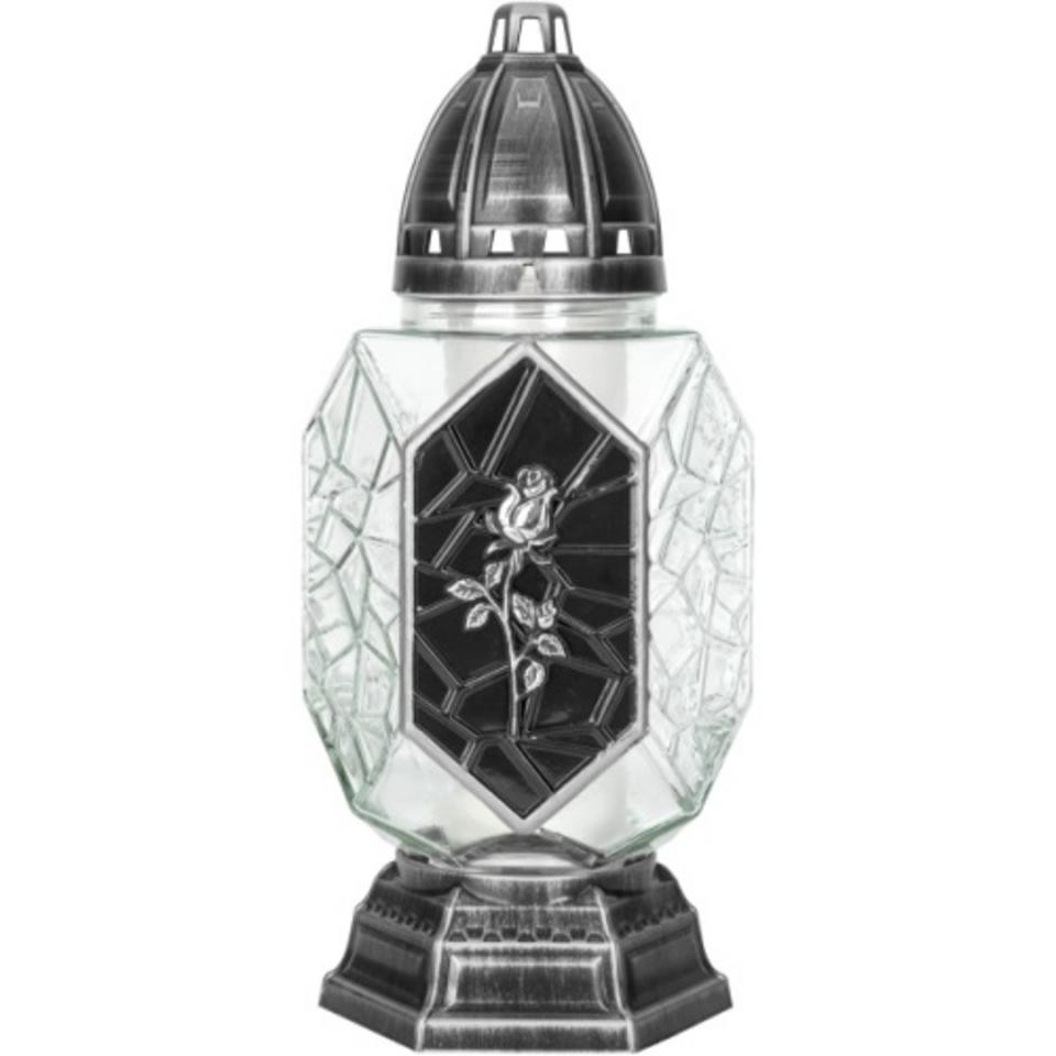 Tradičné sklenené pietne svetlo s ochranným plastovým vekom a stabilnou podstavou, dodávané vrátane parafínovej vložky. S dobou horenia približne 48 hodín a možnosťou výmeny náplne predstavuje praktické a ekonomické riešenie pre celoročnú spomienku na cintorínoch.