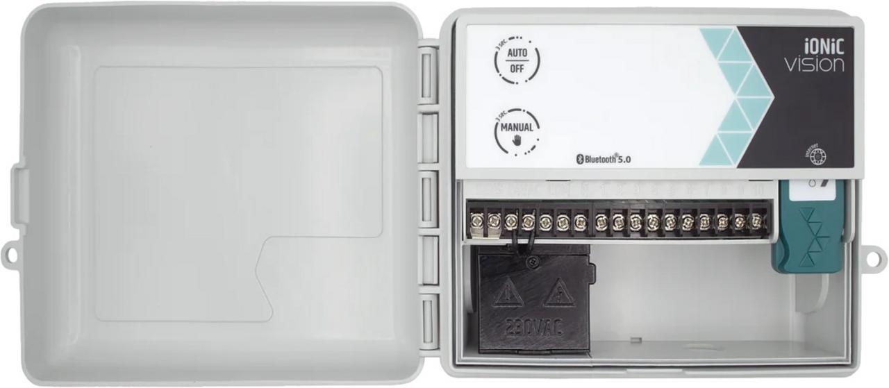 Rain riadiaca jednotka IONIC VISION OUTDOOR je externý nástenný ovládač s interným transformátorom, ktorý poskytuje flexibilné programovacie možnosti (EASY, PRO, ONE-BY-ONE) a bezdrôtové ovládanie cez Bluetooth 5.0 a voliteľné Wi-Fi s Nuvola Mini. Je ideálnym riešením pre efektívnu a spoľahlivú správu zavlažovacích systémov.